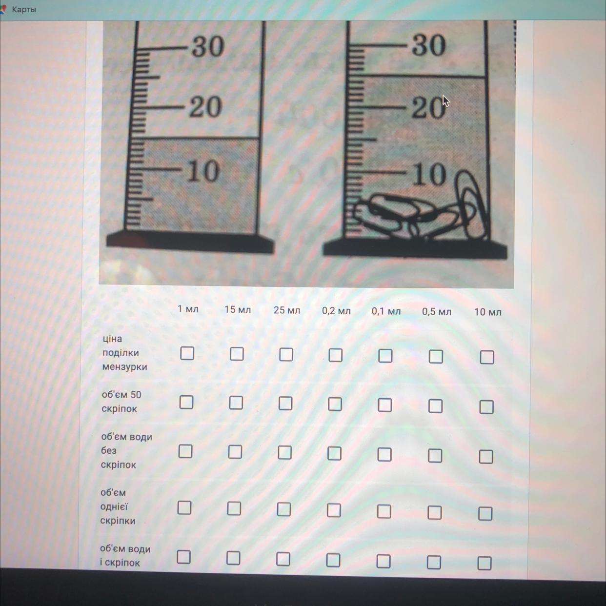 В мензурку з водою вкинули 50 скріпок.Аналізуючи дані рисунка дайте відповіді на питання.
