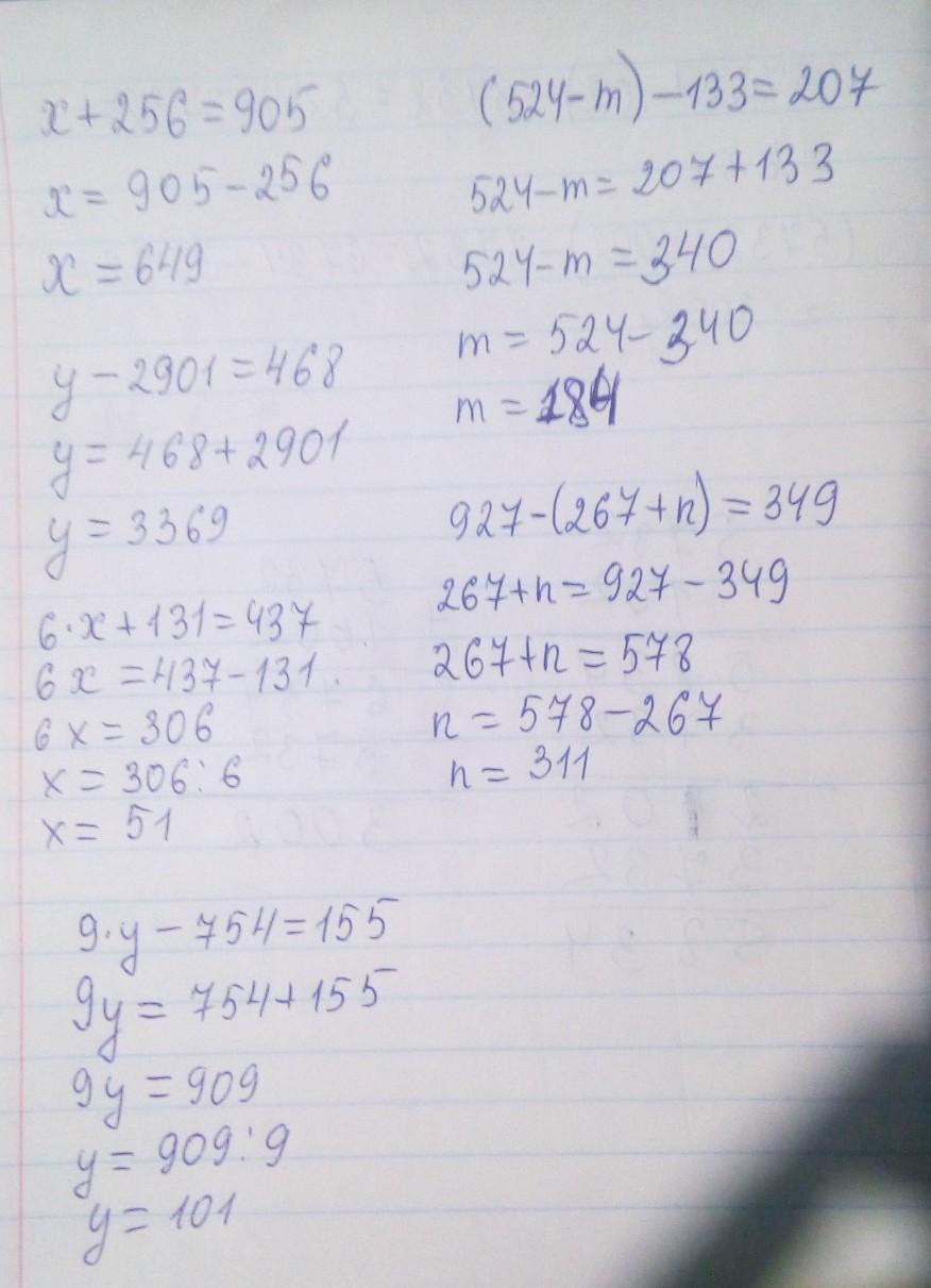 Решите уравнения: А) x+ 256 = 905 Б) У-2901=468 В) (524 - m) - 133=207 Г)927-(267+n)=349 Д)6•х+131=437 Е)9•у-754=155 ПЖЖЖЖ