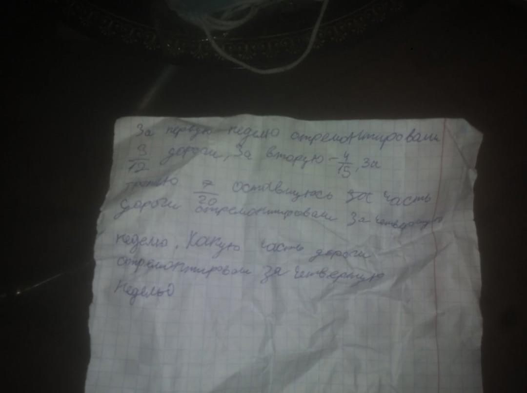 За первую неделю отремонтировали 3\(12) дороги за вторую - 4\(15) за третью 7\(20 оставшуюсь часть дороги отремонтировали за четвертую неделю. Какую часть дороги отремантировали за четвертую неделю
