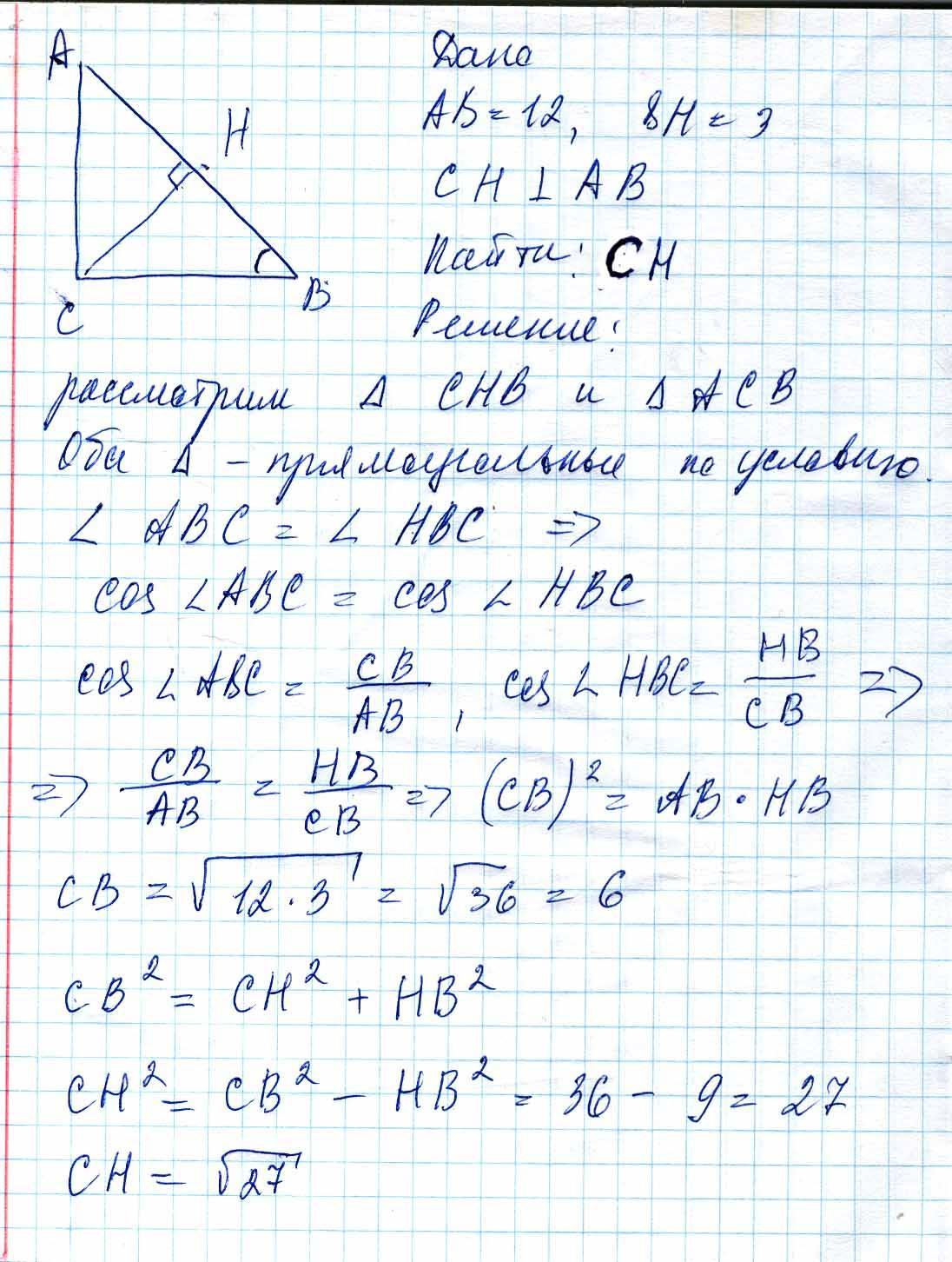В прямоугольном треугольнике АВС с прямым углом С опустили высоту СН на гипотенузу. Известно, что АB = 12, BH = 3.