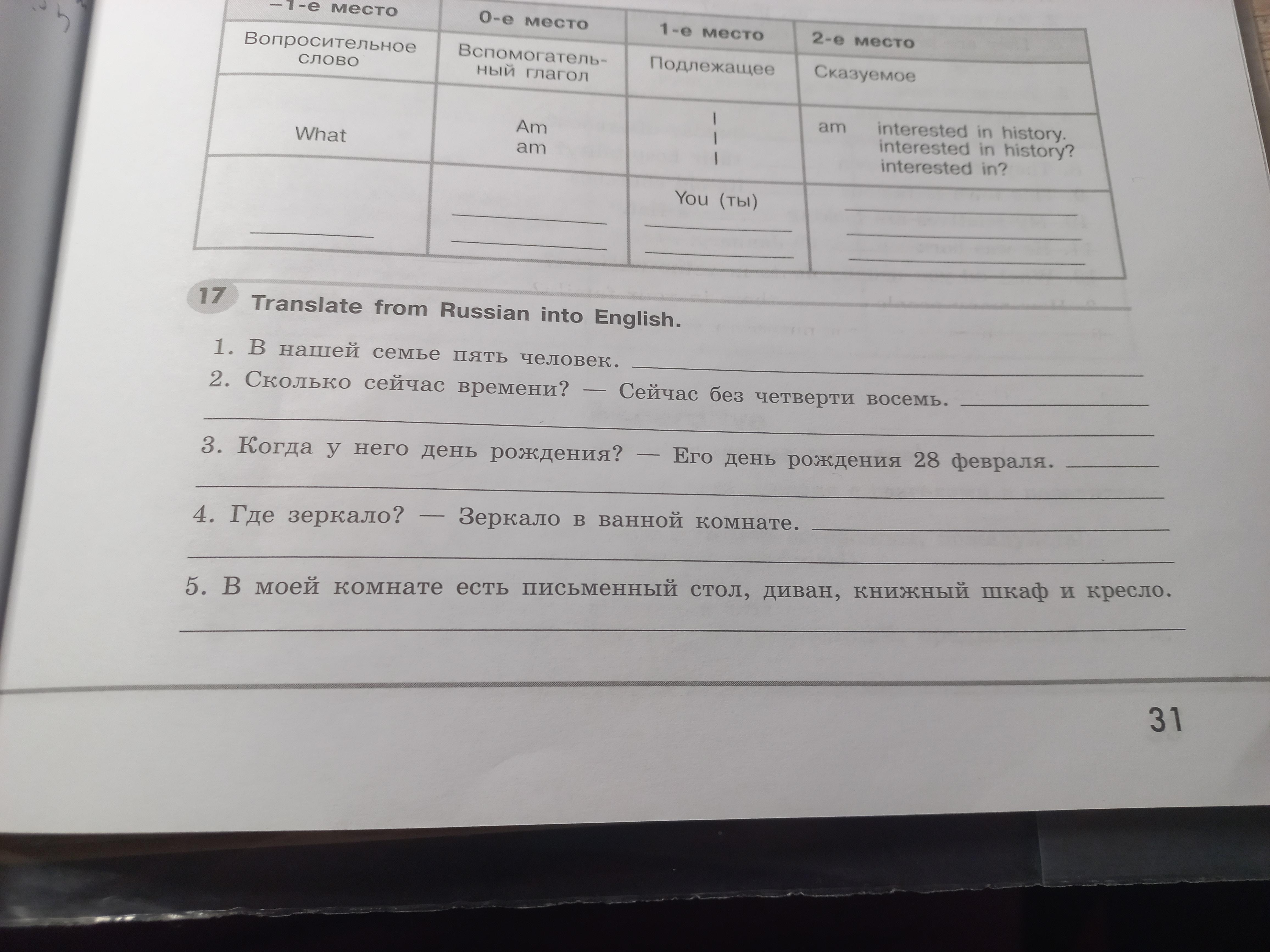ответ : 1) there are 5 people in our family .2) what time is it now ?- it's a quarter to eight now . 3) when is his birthday? - his birthday is February 23. 5) in my room there is a table , a sofa , a bookcase and an armchair. Чувак , ты мог зайти в переводчик и всё перевести там :)