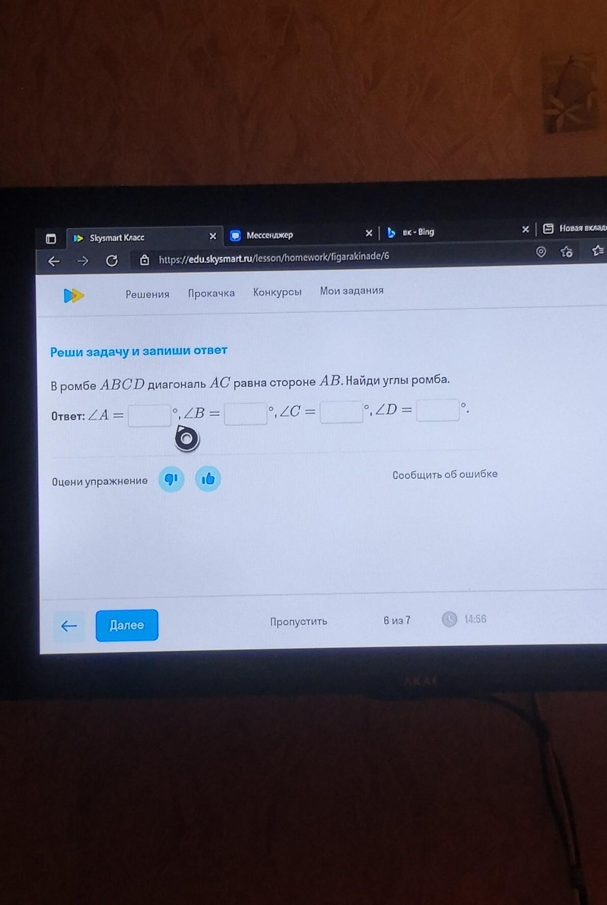 Объяснение: Диагональ АС разбирвает ромб на два равносторонних треугольника, т.к. АВ=ВС=АС, в ΔАВС все углы по 60°, ∠В=∠D- как противоположные углы ромба, а два других тоже равны по 180°-60°=120°, т.к. сумма прилежащих к одной стороне углов ромба равна 180°