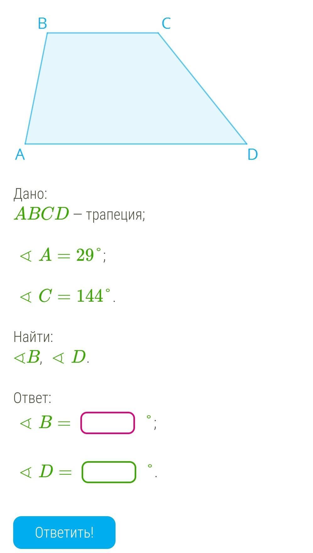 сумма углов трапеции, прилежащих к боковой стороне равна 180° → < В = 180° – < А = 180° – 29° = 151° ; < D = 180° – < С = 180° – 144° = 36°.