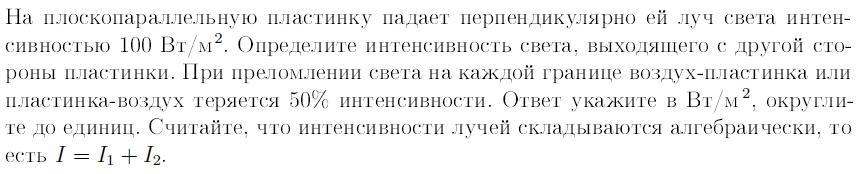 На плоскопараллельную пластинку падает перепендикулярно ей луч света интенсивностью 100