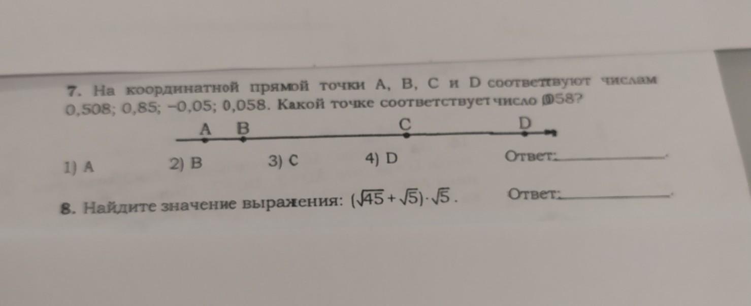 7. Числа А, B, C, D. Где А - наименьшее число, а D - наибольшее число. Соответственно, А = -0,05, B = 0,058, C = 0,508, D = 0,85.