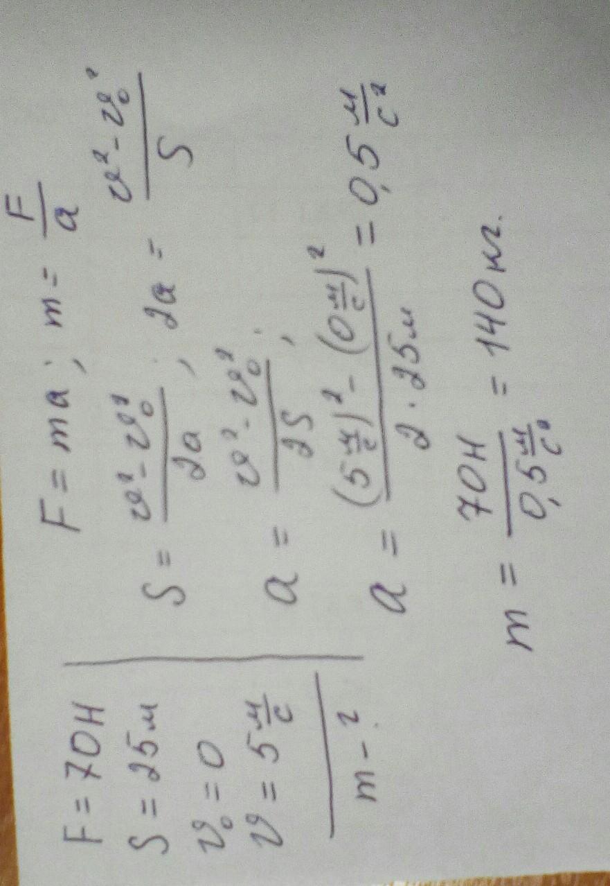 Тело под воздействием силы в 70 Н на отрезке пути в 25 м достигло скорости 5 м/с. Начальная скорость тела равна нулю. Найди массу данного тела.