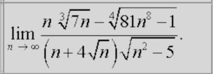 . . . = lim[ ( n ³√ 7n )/n² - ⁴√(81n⁸ - 1 )/n² ]/[( n +4√n )/n * √( n²- 5 )/n ] =