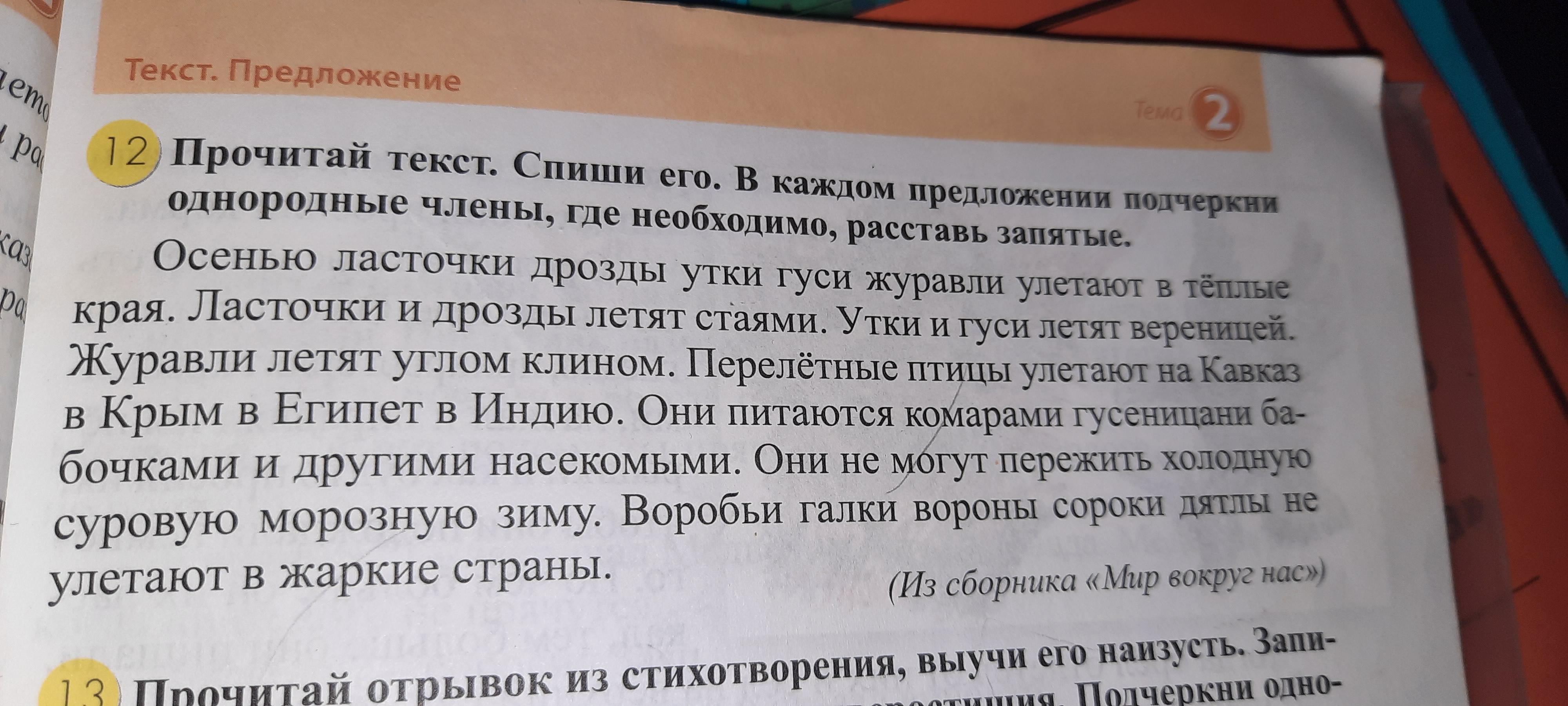 осенью ласточки, дрозды, утки, гуси, журавли улетают в тёплые края. ласточки и дрозды летят стаями. утки и гуси летят вереницей. журавли летят углом, клином. перелётные птицы улетают на Кавказ, в Крым, в Египет в Индию. они питаются комарами, гусеницами, бабочками и другими насекомыми. они не могут пережить холодную, суровую, морозную зиму. воробьи, галки, вороны, строки, дятла не улетают в жаркие страны.