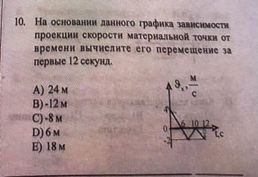 Объяснение: перемещение равно площади под графиком. S = S1 + S2 + S3 = 4×6/2 + 4 × (-2) / 2 + 2 × (-2) / 2 = 18 - 4 - 2 = 12 (m)