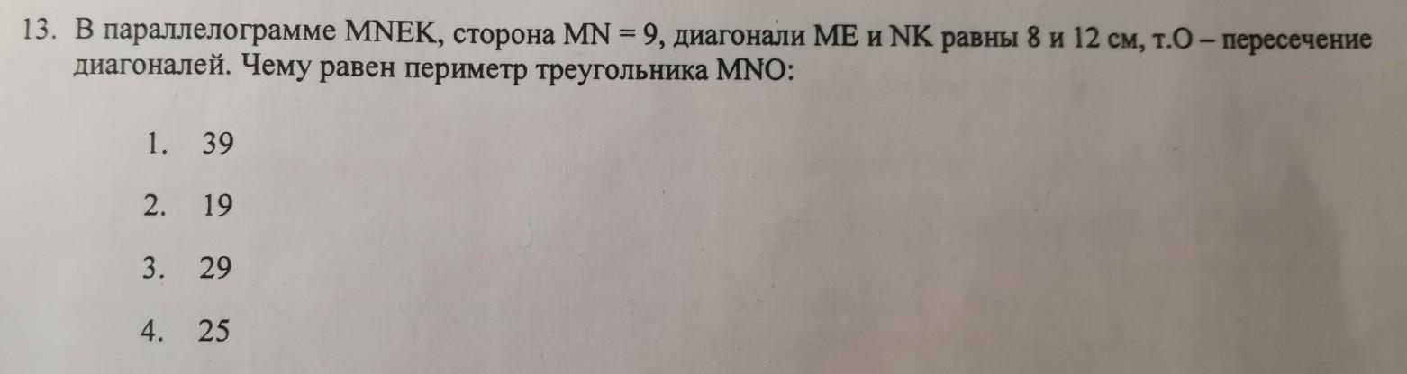 в параллелограмме MNEK, сторона MN равна 9, диагонали ME и NK равны 8 и 12 см, т. О пересечения диагоналей. Чему равен периметр треугольника MNO?