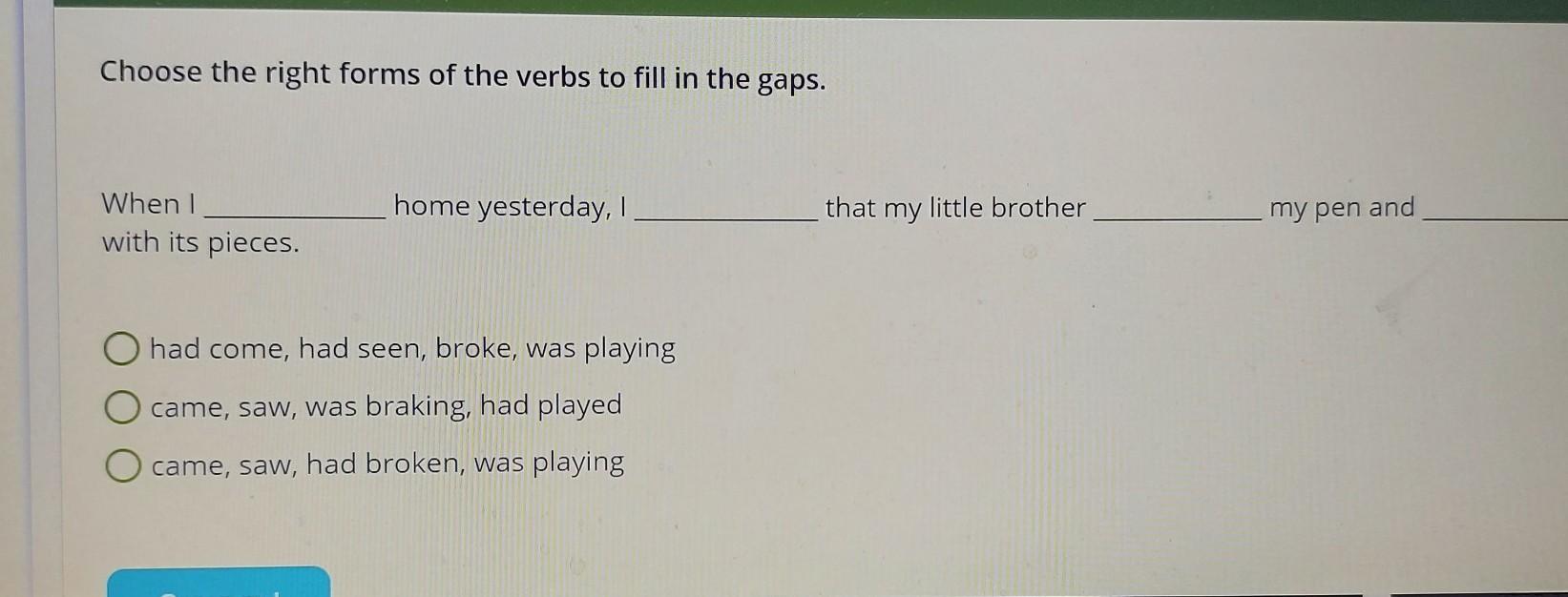 А) had come, had seen, broke, was playing