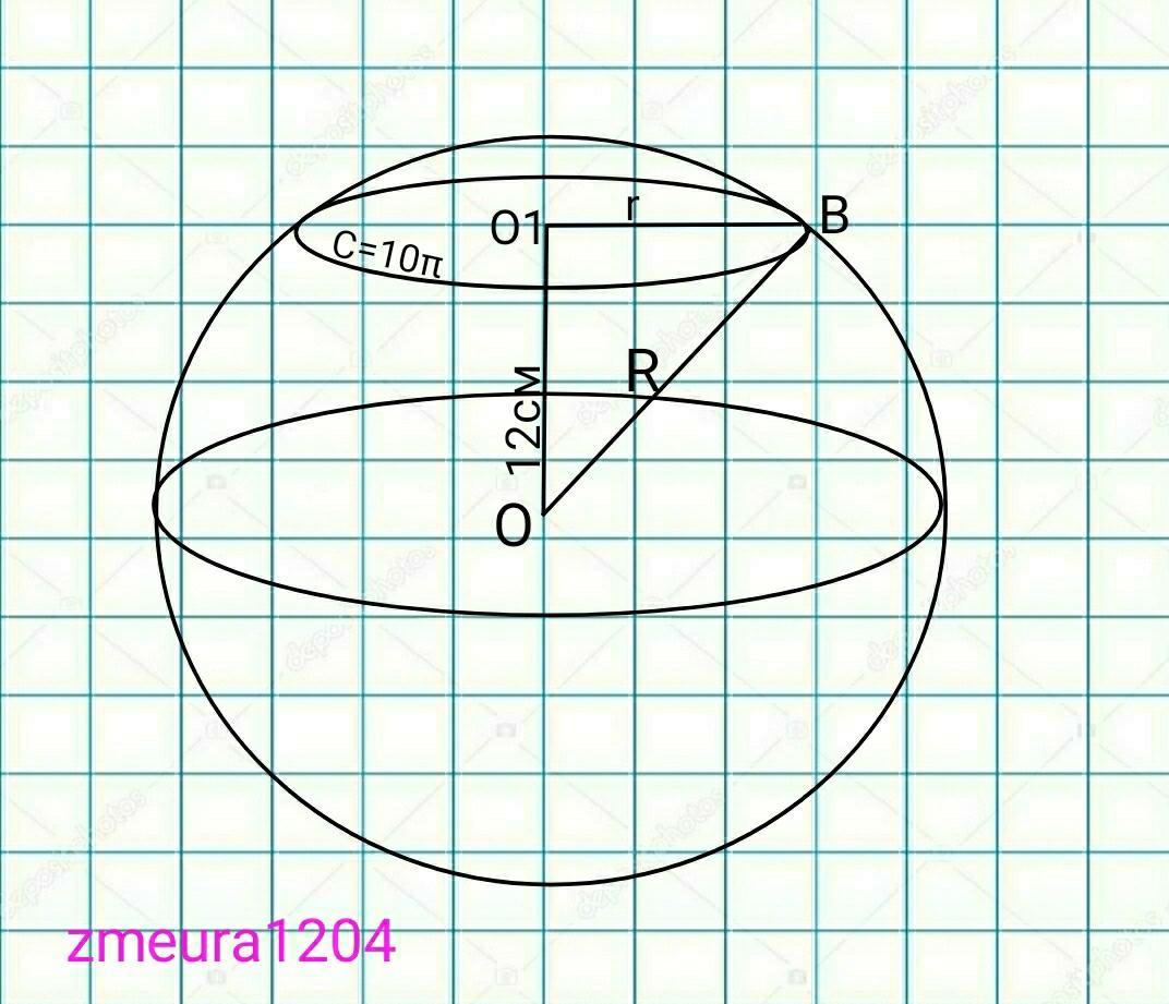Переріз сфери,проведений на відстані 12 см від її центра,є колом,доавжина 10π см.Знайдіть радіус сфери