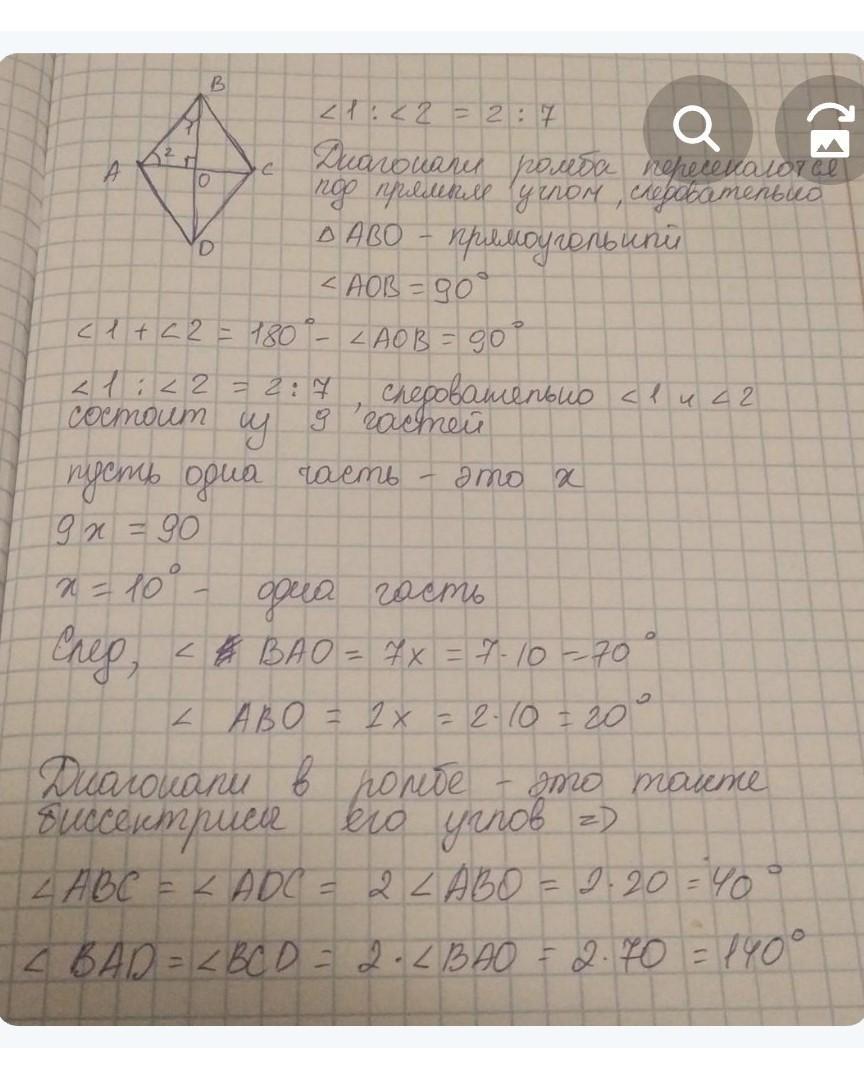 Сторона ромба образует с его диагоналями углы, отношение которых равно 2:7 .