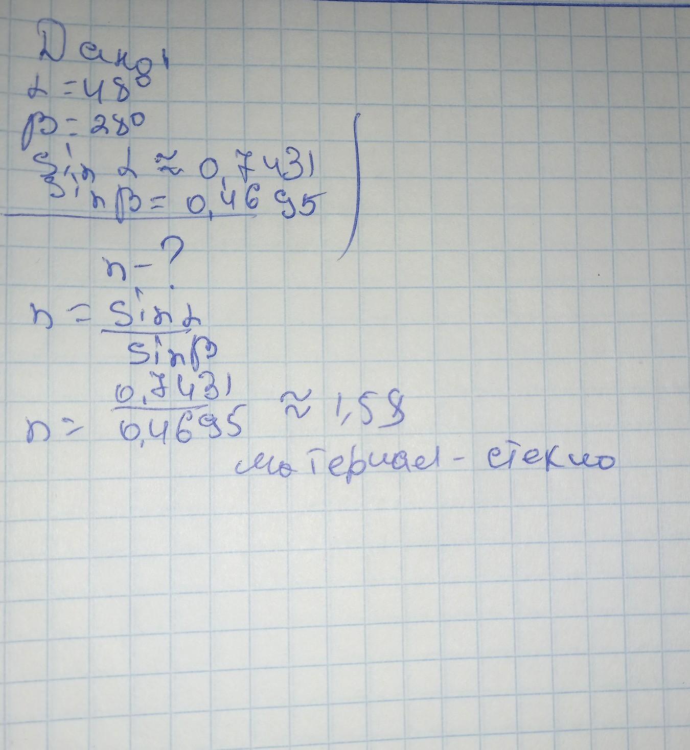 Угол между падающим лучом и центром равен 480, а угол преломления луча ѕinp = 280. Рассчитайте показатель преломления среды. Какая вещь?