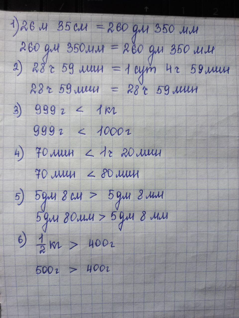 Сравни. Поставь знак больше и меньше или равно. 26м35см и 260дм350мм, 28ч59мин и 1 сут 4ч 59 мин, 999г и 1 кг, 70мин и 1 ч 20 мин, 5 дм8см и 5 дм 8 мм, 1вторая кг и 400 г