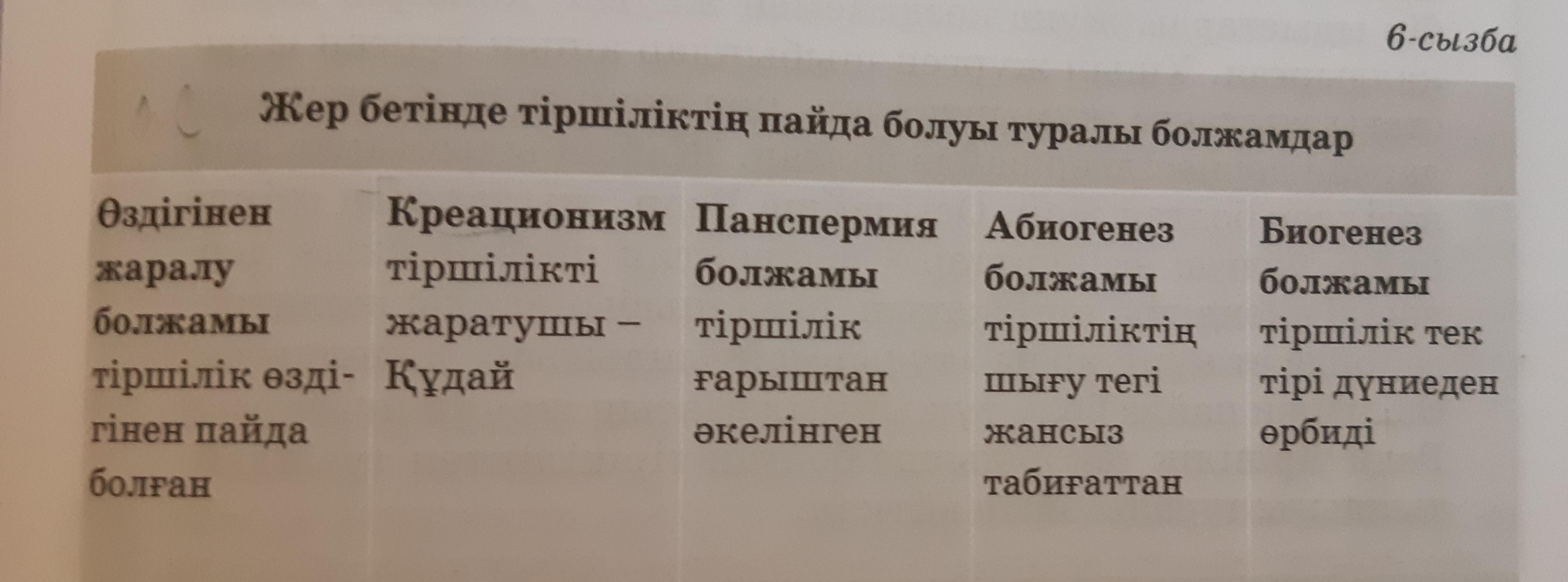 5-тапсырма. 12-кестеде Жер бетінде тіршіліктің пайда болуының басты болжамдары берілген. Тірек сөздермен осы болжамдардың не- гізгі идеясын көрсет. 12-кесте Жер бетінде тіршіліктің пайда болуы болжамдары а) Өздігінен е) Креално- 6) Абиогенез в) Паиспер- г) Биогенез Асарату болжамы мия болжамы болжамы боласамы НІЗМ