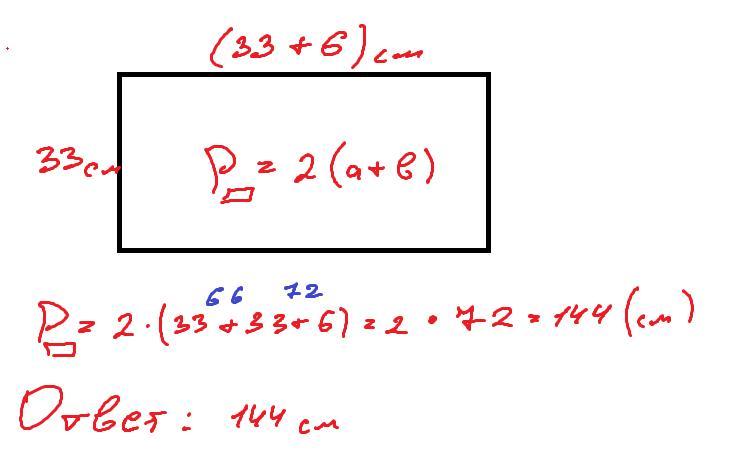 Одна сторона прямоугольника равна 33 см, а вторая — на 6 см больше. Вычисли периметр прямоугольника