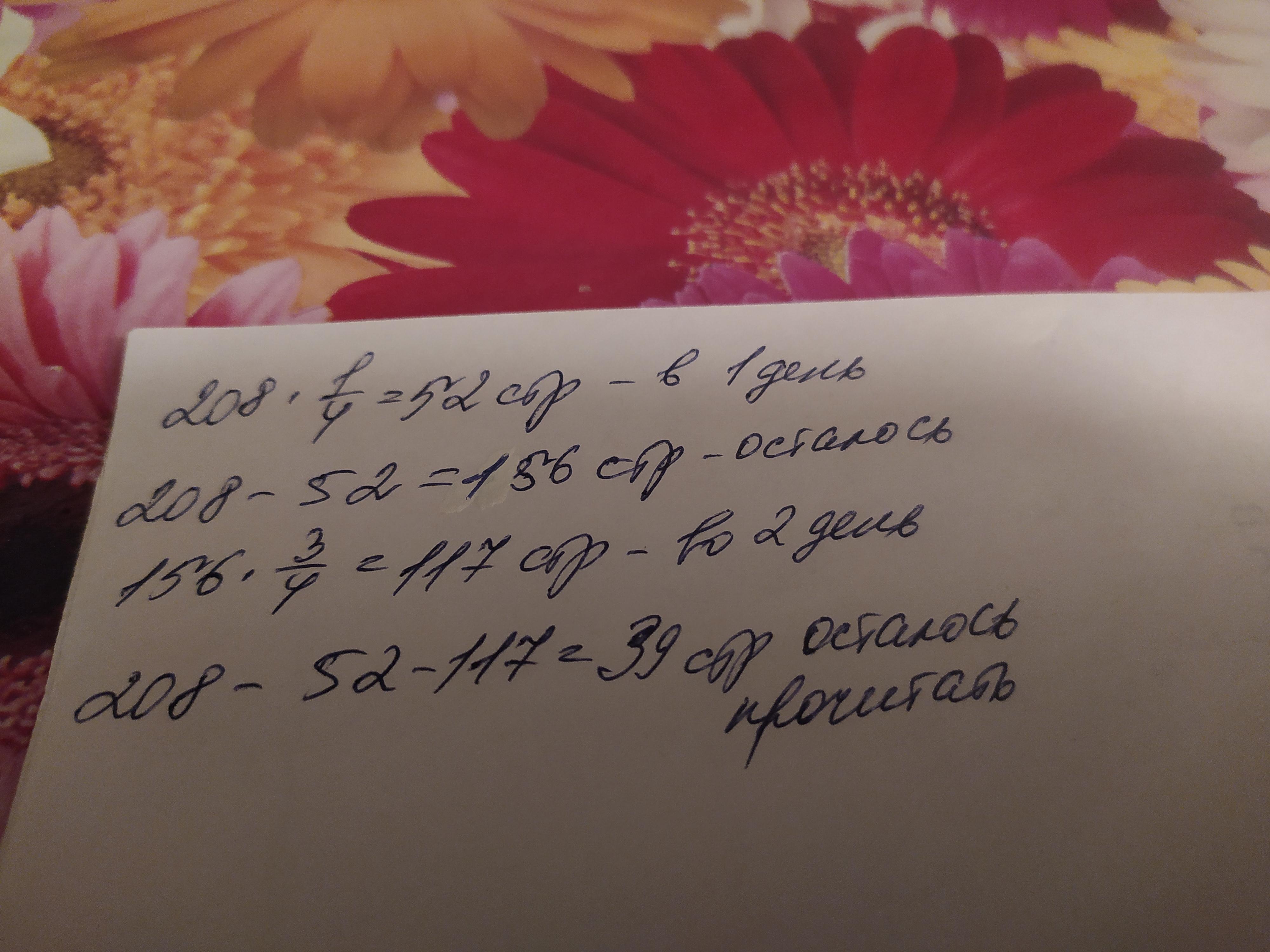 1) 208*1/4=208/4(либо 208÷4)=52 (стр) в первый день