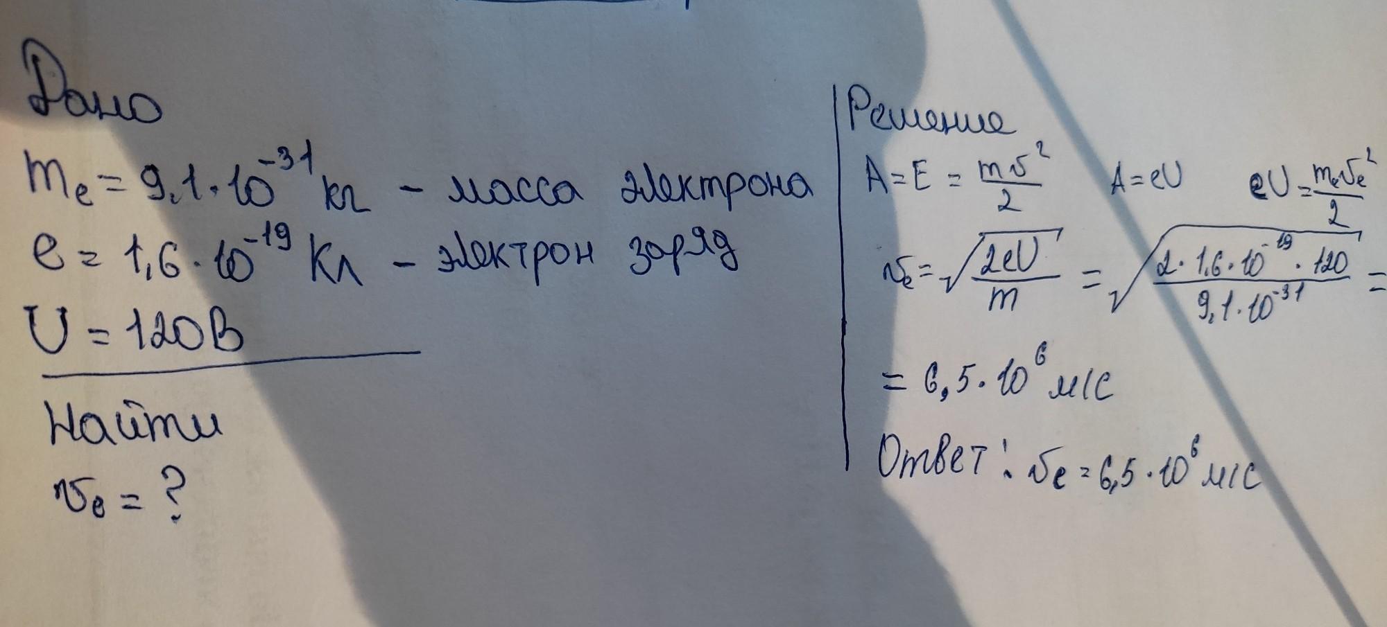 . Определите скорость электрона в электрическом поле, если напряжение между двумя точками поля равно 120 В.
