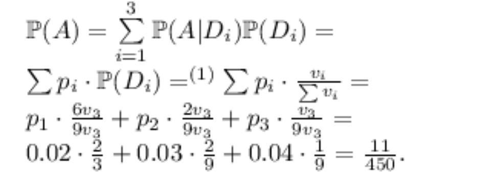 Рабочий обслуживает 3 станка, на которых обрабатываются однотипные детали. Вероятность брака для первого станка равна 0,03, для второго – 0,06, для третьего – 0,04. Обработанные детали складываются в один ящик. Производительность первого станка в три раза больше, чем второго, а третьего в два раза меньше, чем второго. Вероятность того, что взятая наудачу деталь будет бракованной равна: