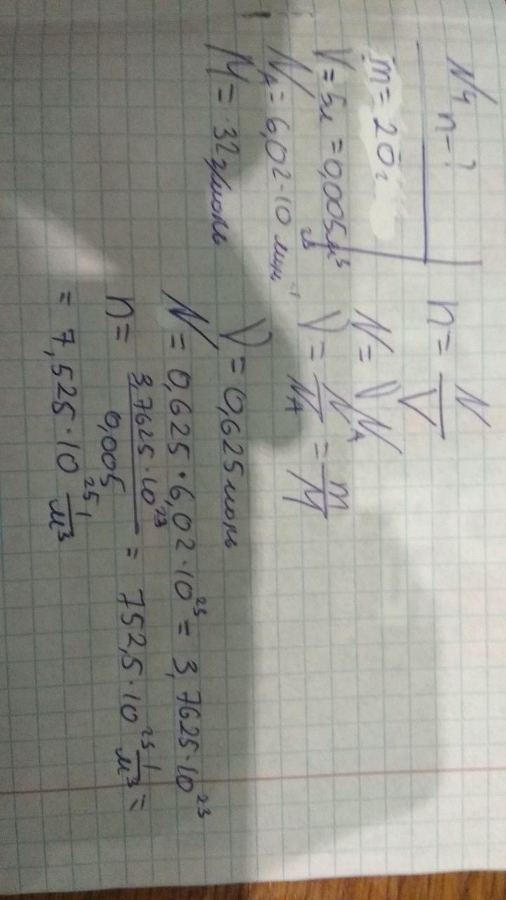 Посудину об'ємом 5 літрів заповнено киснем, маса якого 20 грамм. Визначити концентрацію молекул кисню в цій посудині
