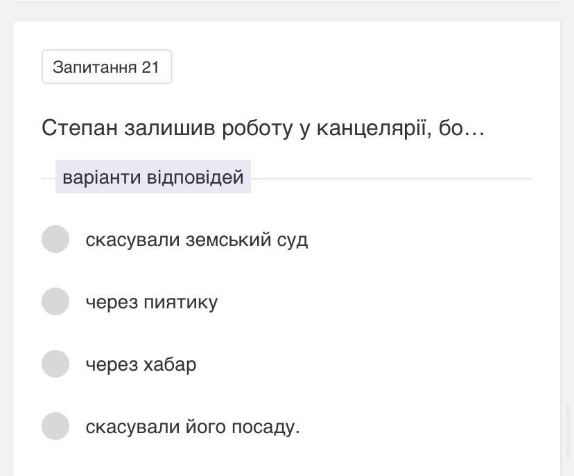Цитата: Погані наші діла, усе пішло шкереберть — і в дворянстві одказали, і земський суд скасували, і я остався за штатом — і куди примоститься, сам не знаю... Тобто, Степан залишився без роботи тому що скасували земський суд