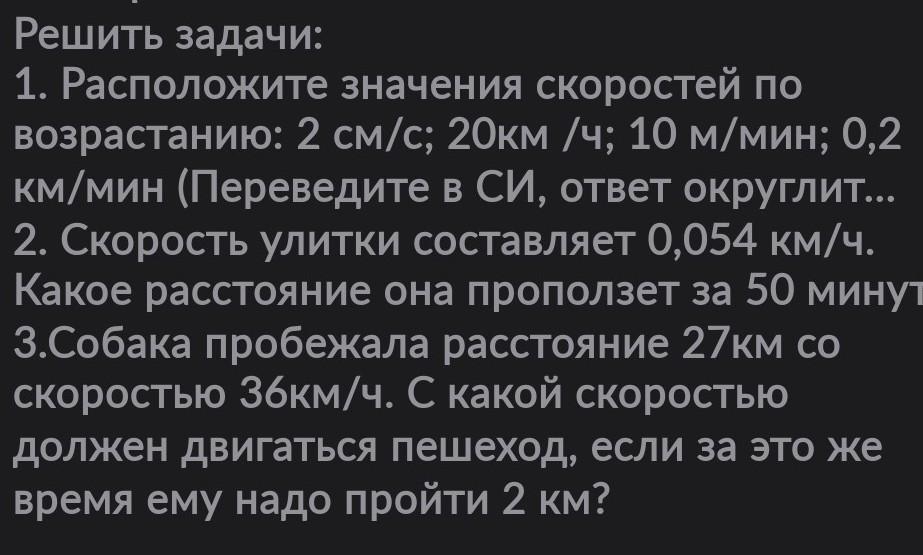 Объяснение:2 см/=0,02 м/с 20 км/час= 5.56 м/с 10 м/мин=0,17 м/с 0,2 км/мин= 3,3 м\с