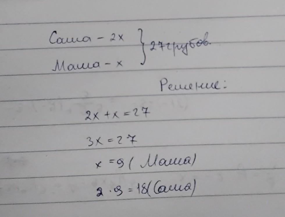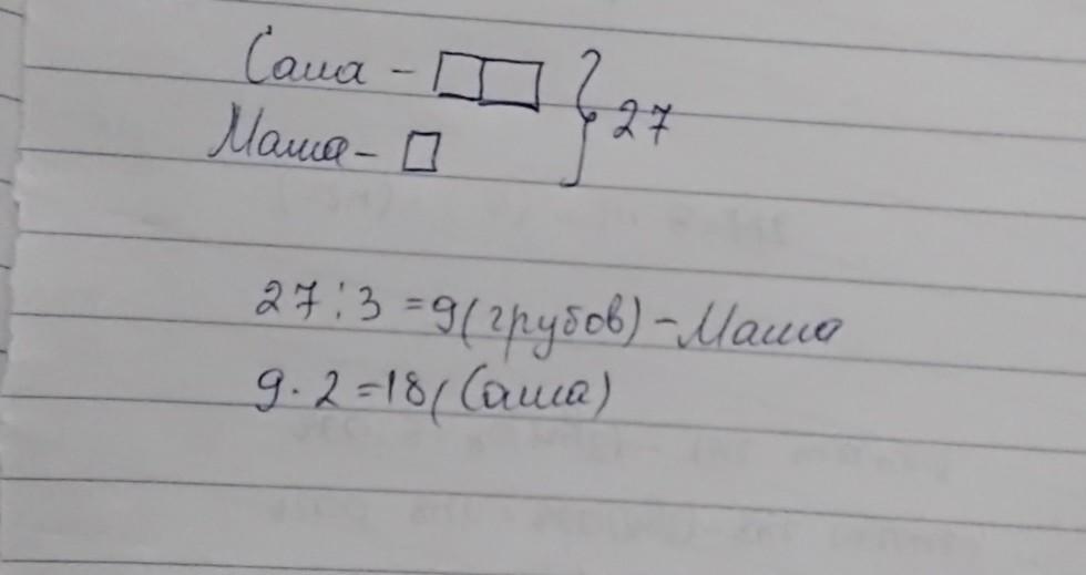помогите решить пожалуйста!саша собрал в 2 раза больше грибов, чем маша. А вмести они собрали 27 грибов. Сколько грибов собрала Маша? Заранне спасибо
