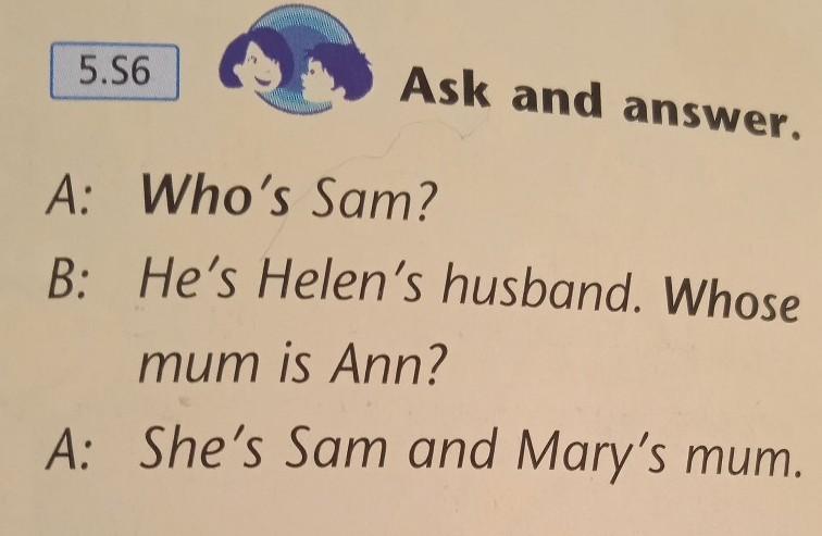 Ask and answer. A: Who's Sam? B: He's Helen's husband. Whose mum is Ann? A: She's Sam and Mary's mum. помагите пожалуйста