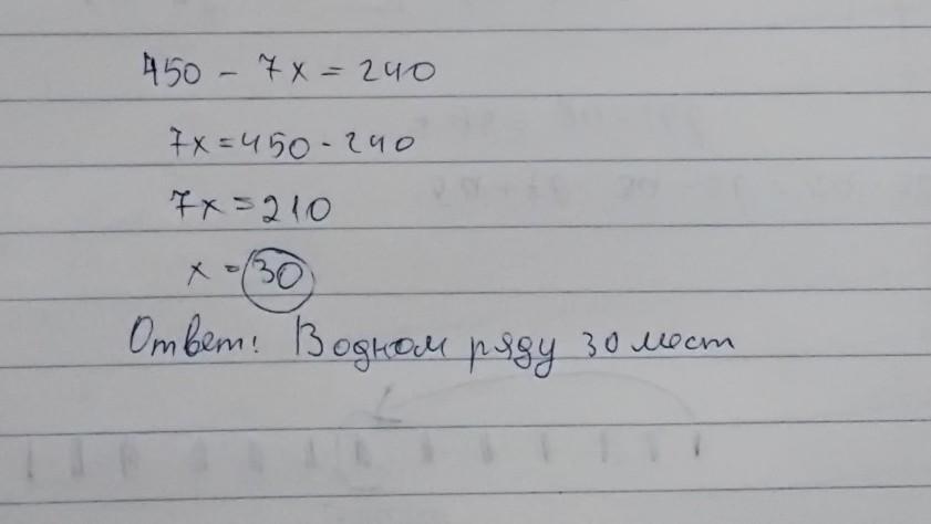 В зале 450мест когда зрители заняли 7 полных рядов в зале осталось 240 свободных мест. Сколько мест в каждом ряду если все ряды одинаковые ?