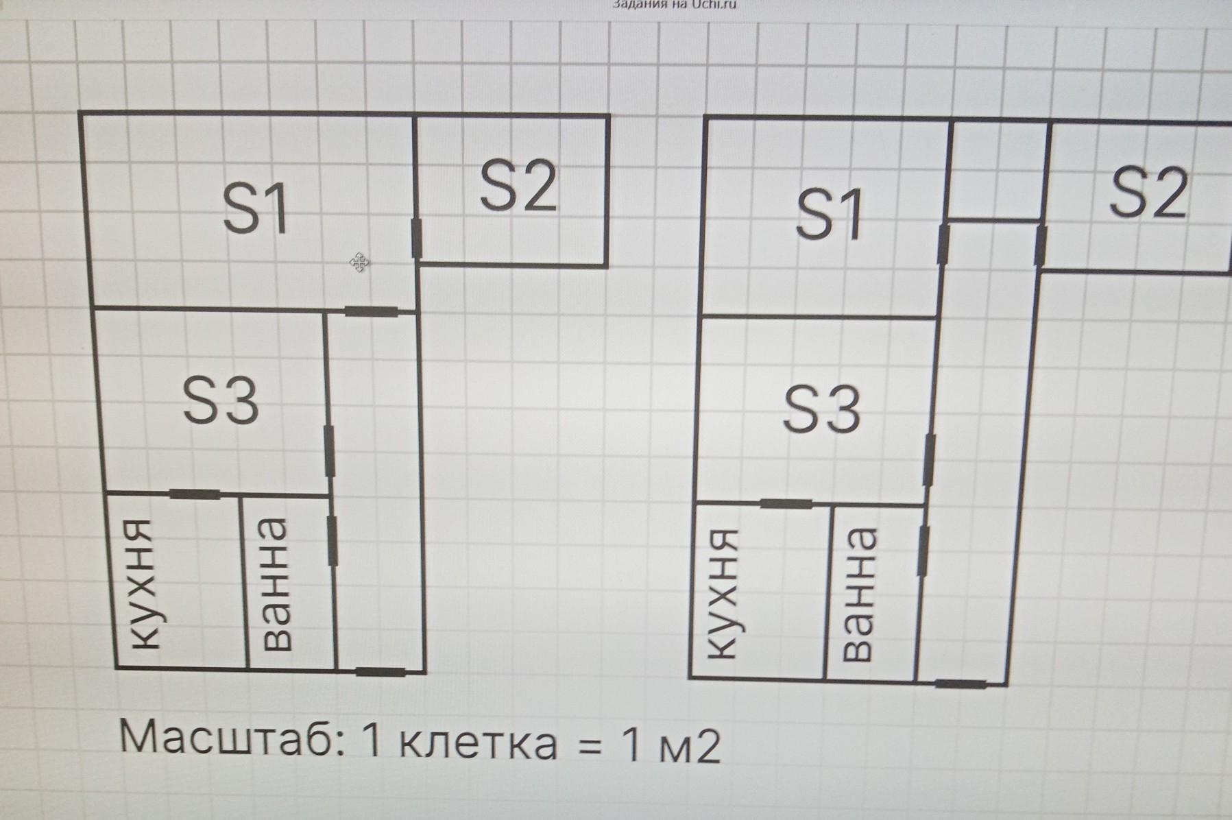 Василий купил квартиру и решил сделать мне перепланировку Посмотри на план квартиры до перепланировки (слева) и план квартиры после перепланировки) (справа) масштаб 1 клетка 1 м (в квадрате) на сколько изменилась площадь комнат номер один и номер два и после перепланировки Запиши ответ числом при расчётах не забудь посмотреть на масштаб