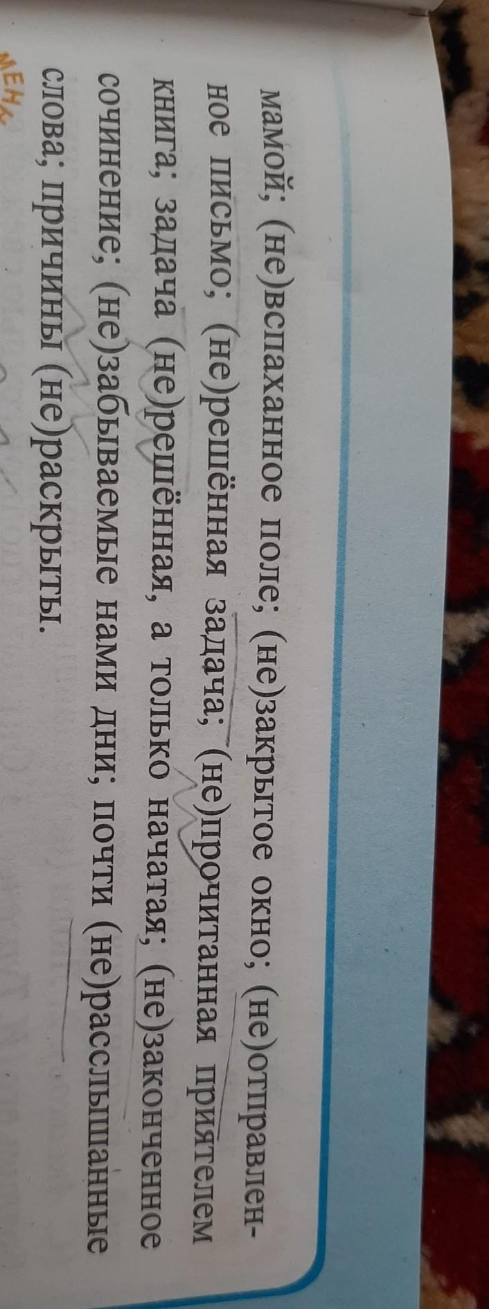 Упражнение 99. Спишите, раскрывая скобки. Графически обозначьте изученную орфограмму. (Не)исследованная путешественниками местность; (не)годующий человек;(не)спетая песня; (не)избалована мамой;
