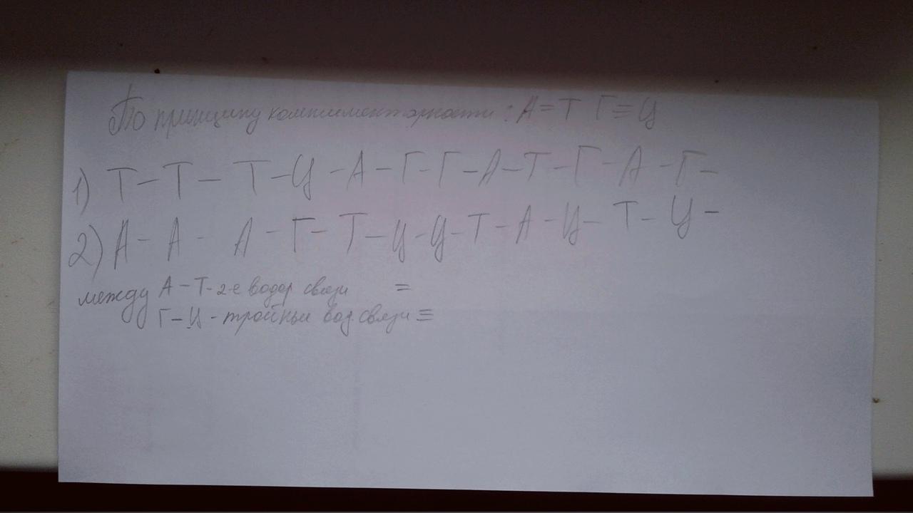 Применяя принцип комплементарности составьте вторую цепь, покажите водородные связи