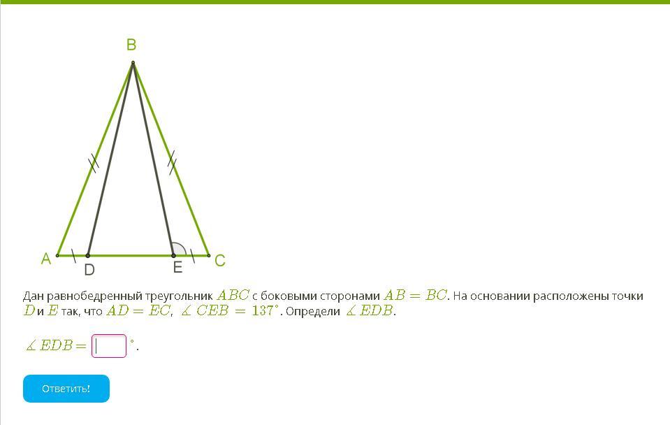Рассмотрим треугольники АВД и ВЕС. они равны по двум сторонам и углу между ними. Значит ВД = ВЕ, треугольник ДВЕ равнобедренный. Углы при основании равны. Угол ДЕС = 180-137= 43°( так как это смежные углы)