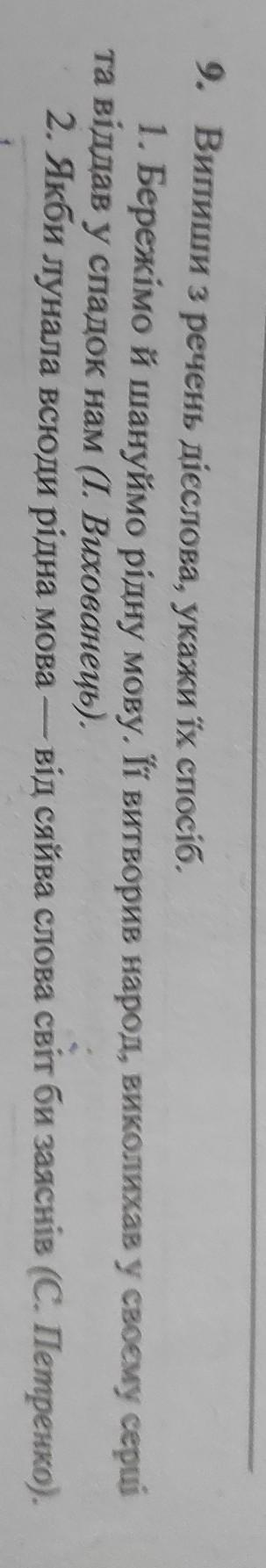 Ответ: Бережімо - наказовий спосіб, шануймо - наказовий спосіб, витворив - дійсний спосіб, виколихав _ дійсний спосіб, віддав - дійсний спосіб, (якби) лунала - умовний спосіб, заяснів би - умовний спосіб.