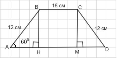 Менша основа рівнобічної трапеції дорівнюють 18 см, бічна сторона 12см, а гострий кут 60°. Знайдіть середню лінію трапеції.