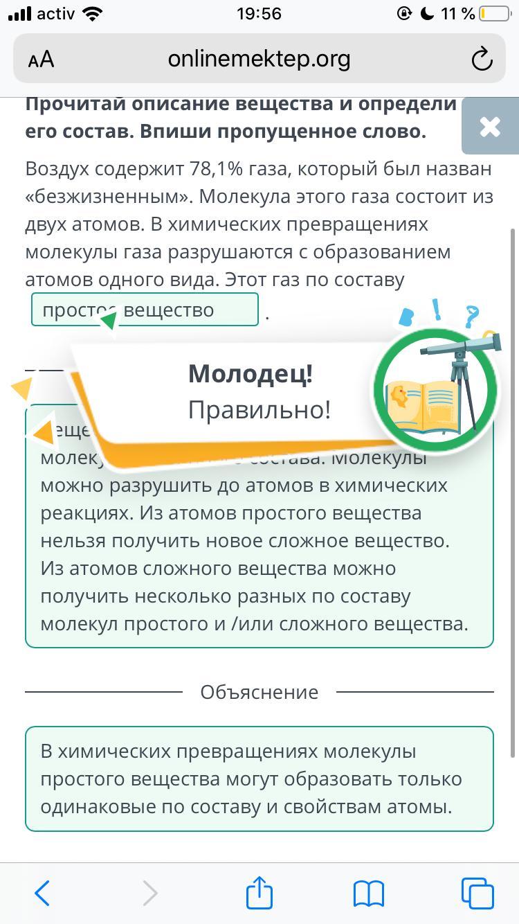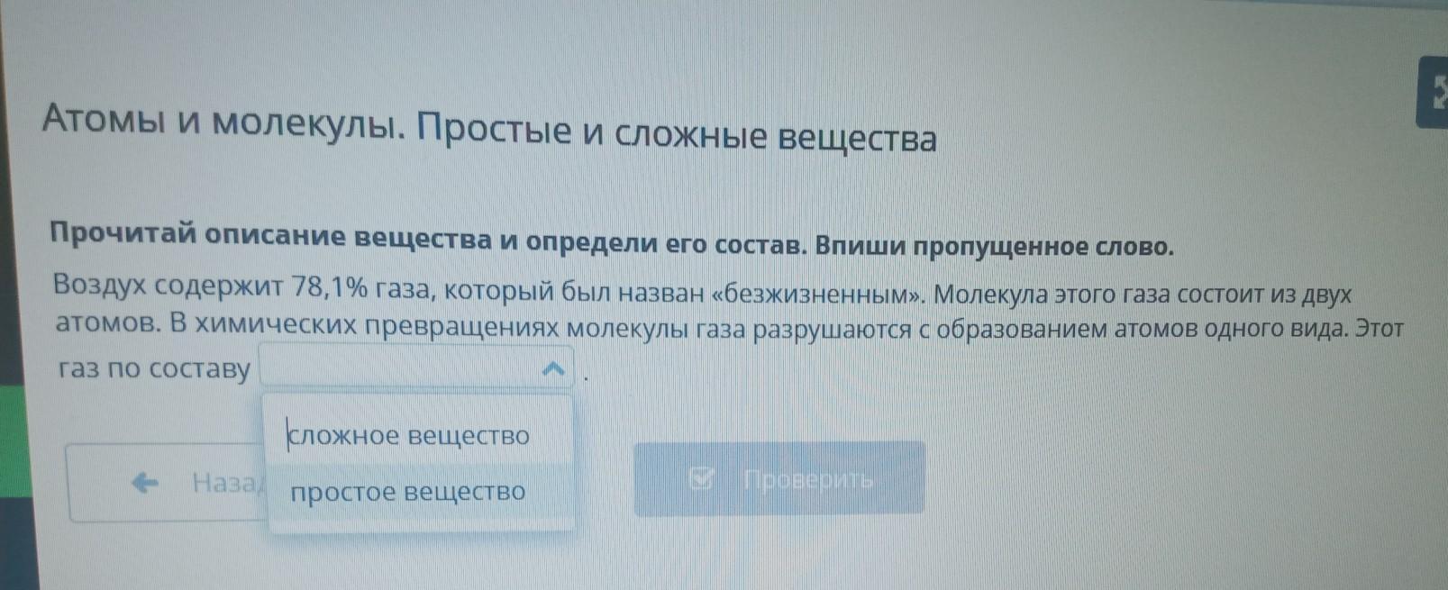 Воздух содержит 78,1% газа, который был назван «безжизненным». Молекула этого газа состоит из двух атомов. В химических превращениях молекулы газа разрушаются с образованием атомов одного вида. Этот газ по составу какое вещество, сложное или простое