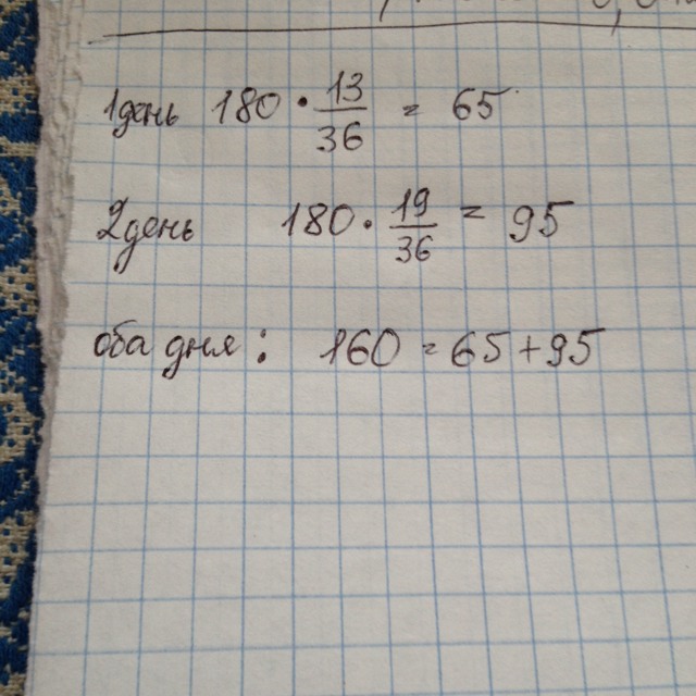 Магазин продал 180кг. апельсинов. Впервый день было продано 13/36 всех апельсинов, а во второй --- 19/36 всех апельсинов. Сколько килограммов апельсинов было продано за два дня?