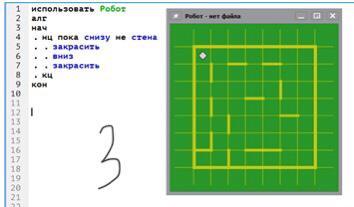 1) Укажите, из каких команд состоит тело цикла для решения следующей задачи (исполнитель Робот): ниже Робота расположен коридор неизвестной длины, необходимо, чтобы Робот закрасил все клетки этого коридора.
