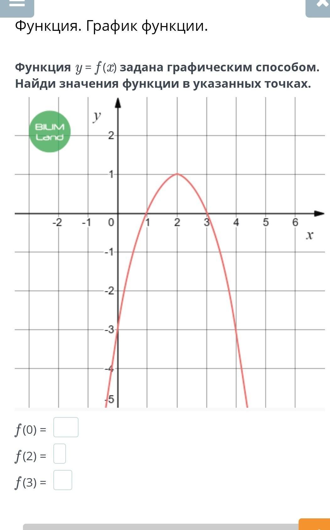 Функция y = f (x) задана графическим способом. Найди значения функции в указанных точках.  f (0) = f (2) = f (3) = Назад Проверить помогите плизз