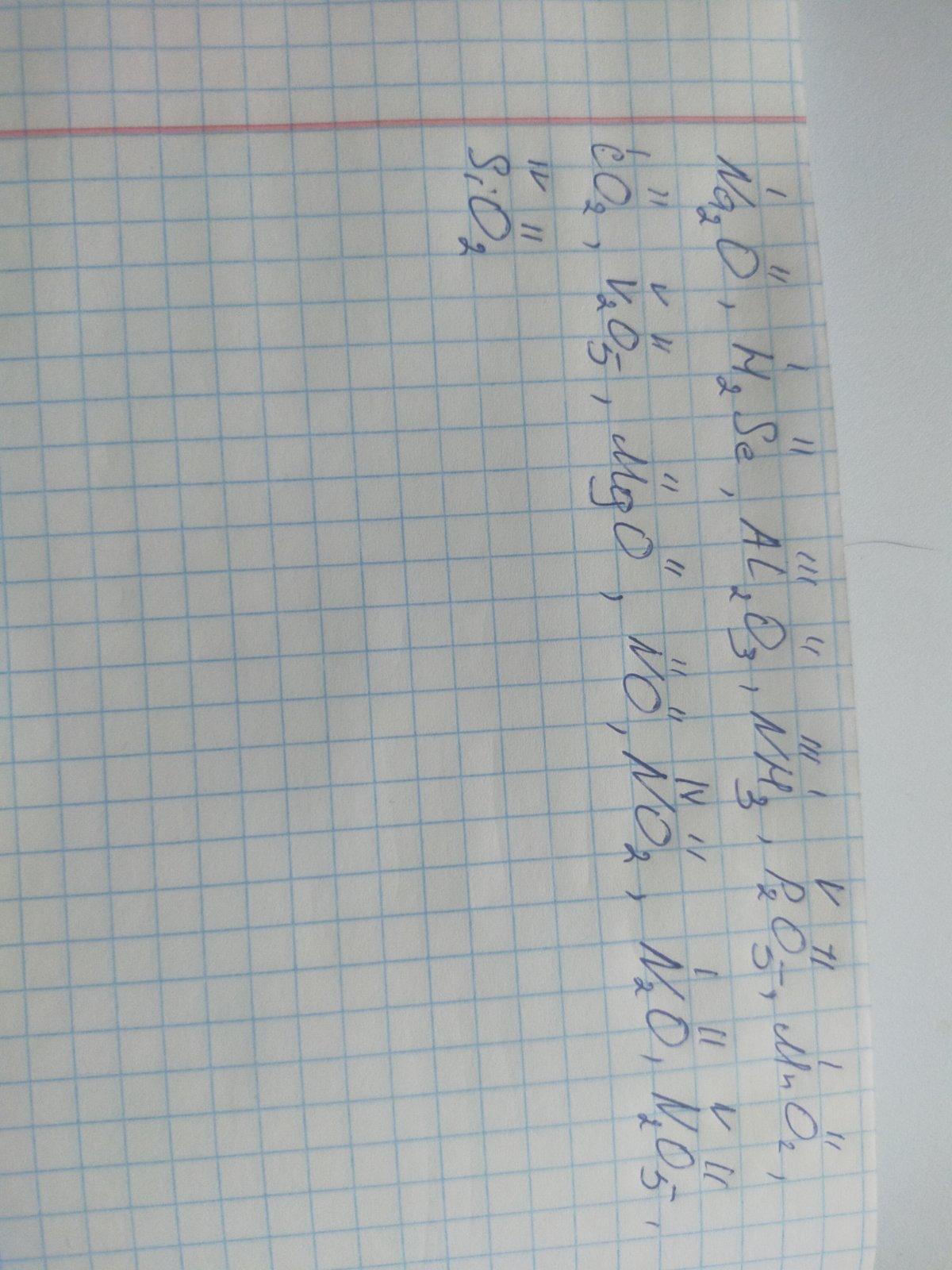 определить валентности элементов в соединениях Na2O,H2Se,Al2O3,NH3,P2O5,MnO2,CO2,V2O5,MgO,NO,NO2,N2O,N2O5,SiO2