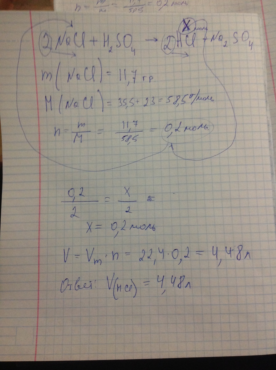 Задача . Определить обьем хлороводорода при н.у., который можно получить действием концентрирования серной кислоты на хлорид натрия массой 11,7"