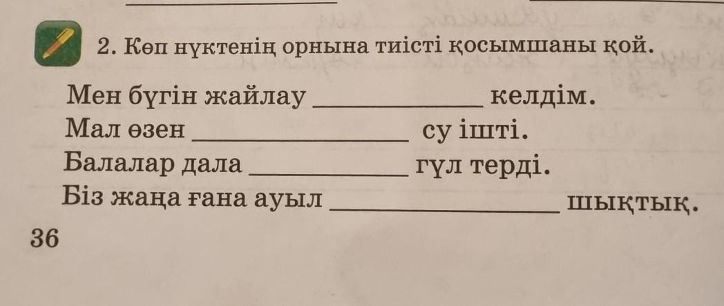су ішті. 2. Көп нүктенің орнына тиісті қосымшаны қой. Мен бүгін жайлау келдім. О. Ови о Мал өзен 9 Балалар дала гүл терді. Пои Біз жаңа ғана ауыл шықтық. 9. 36