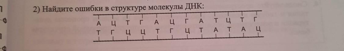 2) Найдите ошибки в структуре молекулы ДНК: Ацт Т Г T гц ц А цг Атц тг Т Гц T А ТА Ц