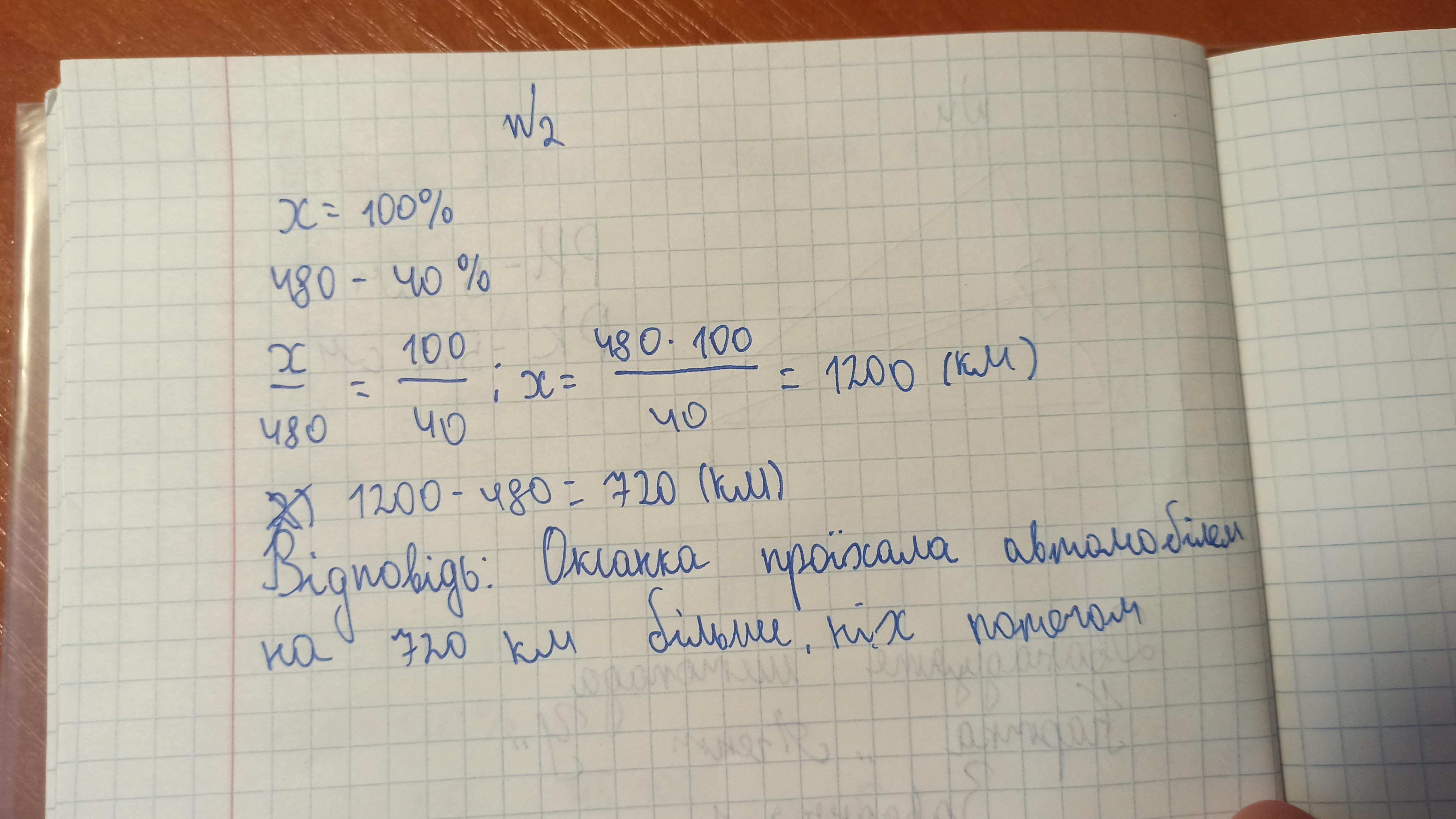 Оксанка проїхала поїздом 480 км, що становить 40 % шля- ху, який вона проїхала автомобілем. На скільки кілометрів більше проїхала дівчинка автомобілем, ніж поїздом?