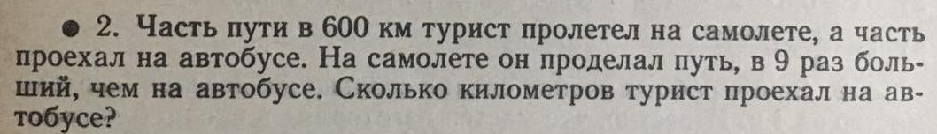 пусть на автобусе турист проехал х км, тогда на самолете он проделал путь 9х км, а всего проделал путь х+9х-10х км.