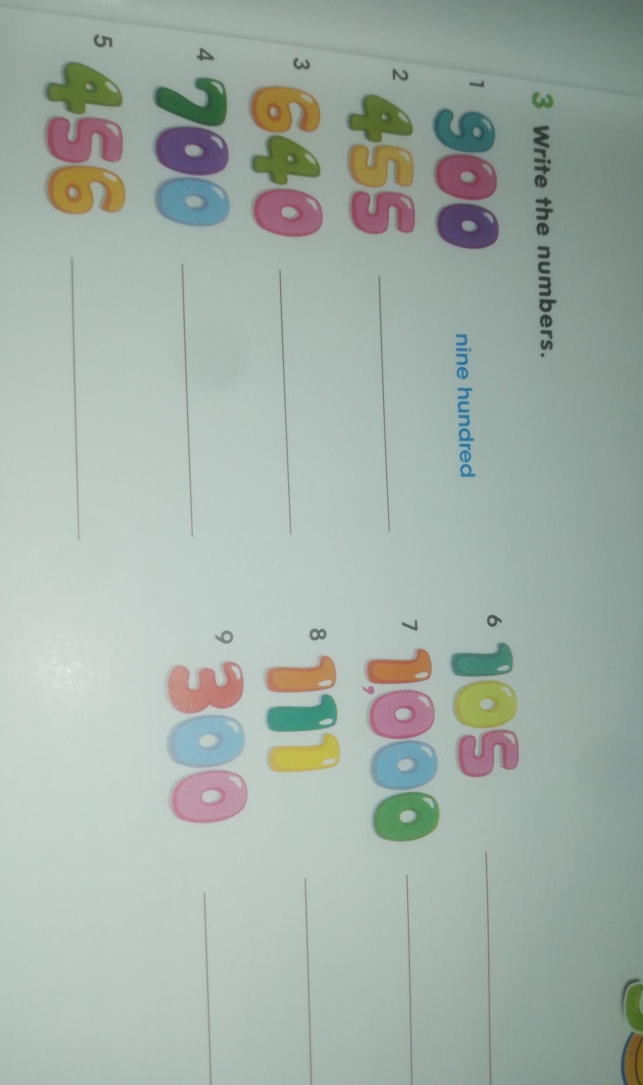 2. five hundred fifty five, 3. six hundred fourty, 4. seven hundred, 5. four hundred fifty six, 6. one hundred five 7. one thousand 8. one hundred eleven 9. three hundred