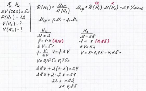 5 л смеси азота и водорода имеют относительную плотность по водороду 12. Определить объем каждого газа в смеси.