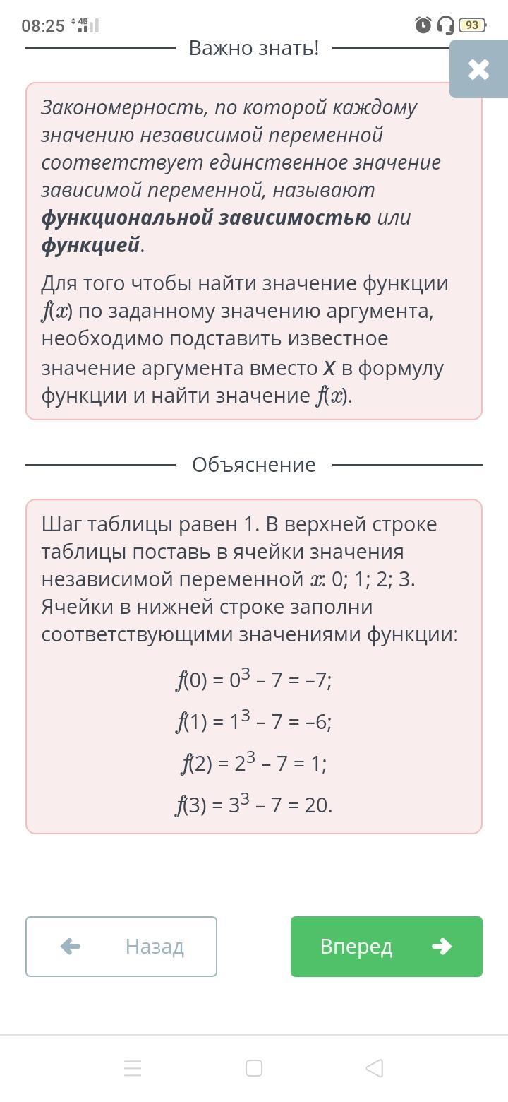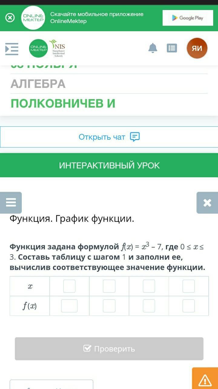 Функция. График функции. Функция задана формулой f(x) = x3 – 7, где 0 ≤ x ≤ 3. Составь таблицу с шагом 1 и заполни ее, вычислив соответствующее значение функции. x f (x) Назад Проверить