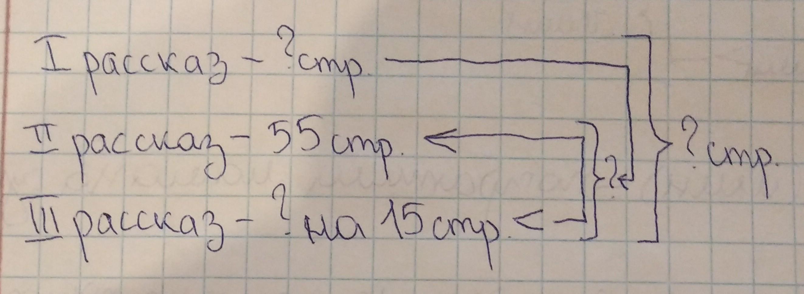 В книге три рассказа. Первый рассказ занимает столько страниц сколько второе третьем месте. Второй рассказ занимает 55 страниц, что на 15 страниц больше, чем занимает третий. Сколько страниц в книге? Решить задачи с краткой записью!!!!